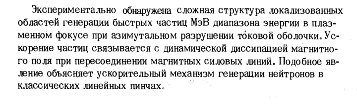 Экспериментально обнаружена сложная структура локализованных областей генерации быстрых частиц МэВ диапазона энергии в плазменном фокусе при азимутальном разрушении токовой оболочки. Ускорение частиц связывается с динамической диссипацией магнитного поля при пересоединении магнитных силовых линий. Подобное явление объясняет ускорительный механизм генерации нейтронов в классических линейных пинчах.