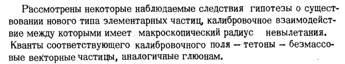 Рассмотрены некоторые наблюдаемые следствия гипотезы о сущест вовании нового типа элементарных частиц, калибровочное взаимодействие между которыми имеет макроскопический радиус невылетания. Кванты соответствующего калибровочного поля — тетоны безмассовые векторные частицы, аналогичные глюонам.