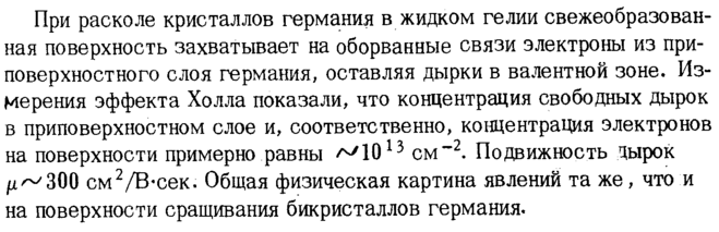 При расколе кристаллов германия в жидком гелии свежеобразованная поверхность захватывает на оборванные связи электроны из приповерхностного слоя германия, оставляя дырки в валентной зоне. Измерения эффекта Холла показали, что концентрация свободных дырок в приповерхностном слое и, соответственно, концентрация электронов на поверхности примерно равны ^1013 см~2. Подвижность дырок 300 см2/В-сек. Общая физическая картина явлений та же, что и на поверхности сращивания бикристаллов германия.