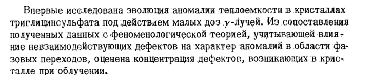 Впервые исследована эволюция аномалии теплоемкости ;в кристаллах триглицинсульфата под действием малых доз ,у-^учей. Из сопоставления полученных данных с 'феноменологической теорией, учитывающей влия -ние невзаимодействующих дефектов на характер аномалий в области фазовых переходов, оценена концентрация дефектов, возникающих в кристалле пт облучении»