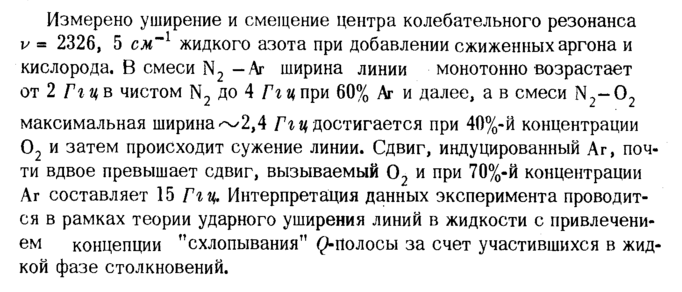Измерено уширение и смещение центра колебательного резонанса ν = 2326, 5 см~1 жидкого азота при добавлении сжиженных аргона и кислорода. В смеси N2 -Аг ширина линии монотонно возрастает от 2 Г г ц в чистом N2 до 4 Γι ц при 60% Аг и далее, а в смеси Ν2-02 максимальная ширина ~2,4 Г г ц достигается при 40%-й концентрации 02 и затем происходит сужение линии. Сдвиг, индуцированный Аг, почти вдвое превышает сдвиг, вызываемый 02 и при 70%-й концентрации Аг составляет 15 Г ι υ,. Интерпретация данных эксперимента проводится в рамках теории ударного уширения линий в жидкости с привлечением концепции "охлопывания" (^-полосы за счет участившихся в жидкой фазе столкновений.