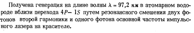 Получена генерация на длине волны λ = 97,2 им в атомарном водороде вблизи перехода 4Р— IS путем резонансного смешения двух фотонов второй гармоники и одного фотона основной частоты импульсного лазера на красителе.