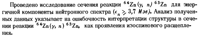 Проведено исследование сечения реакции 6*Ζη{γ, η) 63Ζη для энергичной компоненты нейтронного спектра (е >, 3,7 Мэв), Анализ полученных данных указывает на ошибочность интерпретации структуры в сечении реакции 6*Zn(y, η) 63Ζη, как проявления изоспинового расщепления.