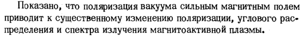 Показано, что поляризация вакуума сильным магнитным полем приводит к существенному изменению поляризации, углового распределения и спектра излучения магнитоактивной плазмы.