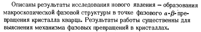 Описаны результаты исследования нового явления — образования макроскопической фазовой структуры в точке фазового α-βпревращения кристалла кварца. Результаты работы существенны для выяснения механизма фазовых превращений в кристаллах.