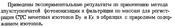 Приведены экспериментальные результаты по применению метода двухступенчатой фотоионизации и фильтрации по массам для регистрации СТС нечетных изотопов Dy и Ег в образцах с природным содержанием изотопов.