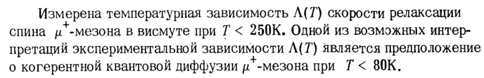 Измерена температурная зависимость Л(Г) скорости релаксации спина μ^-мезона в висмуте при Τ < 250К. Одной из возможных интерпретаций экспериментальной зависимости А{Т) является предположение о когерентной квантовой диффузии /1+-мезона при Τ < 80К.