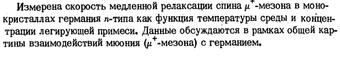 Измерена скорость медленной релаксации спина μ^-мезона в монокристаллах германия л-типа как функция температуры среды и концентрации легирующей примеси. Данные обсуждаются в рамках общей картины взаимодействий мюония (/*+-мезона) с германием.