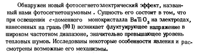 Обнаружен новый фотосегнето электрический эффект, названный нами фотосегнетошумовым . Сущность его состоит в том, что при освещении с-доменного монокристалла BaTi03 на электродах, нанесенных на грань (001) возникает флуктуирующее напряжение в широком частотном диапазоне, значительно превышающее уровень тепловых шумов. Исследованы некоторые особенности явления и рассмотрены возможные его механизмы.