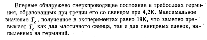 Впервые обнаружено сверхпроводящее состояние в трибослоях германия, образованных при трении его со свинцом при 4,2К. Максимальное значение Г , полученное в экспериментах равно 19К, что заметно превышает Тс как для массивного свинца, так и для свинцовых пленок, напыленных на германий.