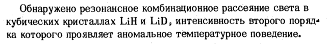 Обнаружено резонансное комбинационное рассеяние света в кубических кристаллах LiH и LiDs интенсивность второго поряд^ ка которого проявляет аномальное температурное поведение.