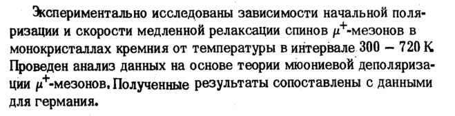 Экспериментально исследованы зависимости начальной поляризации и скорости медленной релаксации спинов /х+-мезонов в монокристаллах кремния от температуры в интервале 300 720 К Проведен анализ данных на основе теории мюониевой деполяризации /1+-мезонов. Полученные результаты сопоставлены с данными для германия.