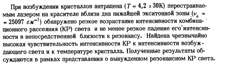 При возбуждении кристаллов антрацена (Г = 4,2 + ЗОК) перестраиваемым лазером на красителе вблизи дна нижайшей экситонной зоны (vo = = 25097 см'1) обнаружено резкое возрастание интенсивности комбинационного рассеяния (КР) света и не менее резкое падение его'интенсив-ности в непосредственной близости к резонансу. Найдена чрезвычайно высокая чувствительность интенсивности КР к интенсивности возбуж -дающего света и к температуре кристалла. Полученные результаты обсуждаются в рамках представления о вынужденном резонансном КР света.