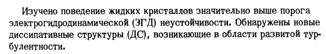 Изучено поведение жидких кристаллов значительно выше порога электрогидродинамической (ЭГД) неустойчивости. Обнаружены новые диссипативные структуры (ДС), возникающие в области развитой турбулентности.