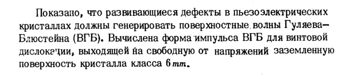 Показано, что развивающиеся дефекты в пьезоэлектрических кристаллах должны генерировать поверхностные, волны Гуляева— Бдюстейна (ВГБ). Вычислена форма импульса ВГБ для винтовой дислокации, выходящей на свободную от напряжений заземленную поверхность кристалла класса 6ш.