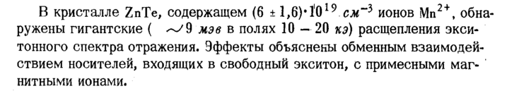 В кристалле ZnTe, содержащем (6 ± 1,6)* 1'019 см"3 ионов Мп2 + , обнаружены гигантские ( мэв в полях 10 — 20 кэ) расщепления экси-тонного спектра отражения. Эффекты объяснены обменным взаимодействием носителей, входящих в свободный экситон, с примесными маг' нитными ионами.