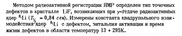 Методом радиоактивной регистрации ЯМР определен тип точечных дефектов в кристалле LiF, возникающих при у-0тдаче радиоактивных ядер 8,Li {Ту = 0,84 сек)..Измерены константа квадрупольного взаи-модействия^ядер 8iLi с дефектом, энтальпия активации и время жизни дефектов в области температур 13 + 295К.