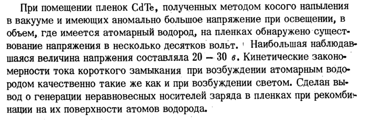 При помещении пленок CdTe, полученных методом косого напыления в вакууме и имеющих аномально большое напряжение при освещении, в объем, где имеется атомарный водород, на пленках обнаружено существование напряжения в несколько десятков вольт. 1 Наибольшая наблюдавшаяся величина напржения составляла 20 — 30 в. Кинетические закономерности тока короткого замыкания при возбуждении атомарным водородом качественно такие же как и при возбуждении светом. Сделан вывод о генерации неравновесных носителей заряда в пленках при рекомби;-нации на их поверхности атомов водорода.