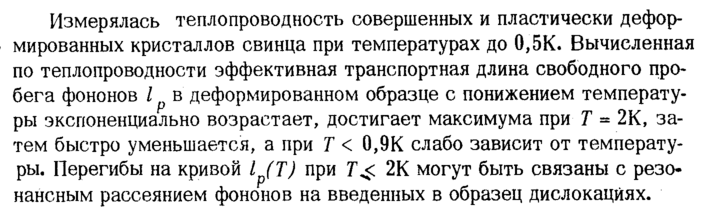 Измерялась теплопроводность совершенных и пластически деформированных кристаллов свинца при температурах до 0,5К. Вычисленная по теплопроводности эффективная транспортная длина свободного пробега фононов / в деформированном образце с понижением температуры экспоненциально возрастает, достигает максимума при Τ = 2К, затем быстро уменьшается, а при Τ < 0,9К слабо зависит от температуры. Перегибы на кривой I (Т) при Т^. 2К могут быть связаны с резонансным рассеянием фононов на введенных в образец дислокациях.