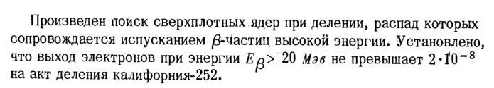 Произведен поиск сверхплотных.ядер при делении, распад которых сопровождается испусканием /3-^астиц высокой энергии. Установлено, что выход электронов при энергии Ео> 20 Мэв не превышает 2·Ϊ0~"8 на акт деления калифорния-252.