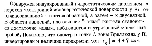 Обнаружен индуцированный гидростатическим давлением ρ переход электронной изоэнергетической поверхности у Bi от эллипсоидальной к гантелеобразной, а затем к двусвязной. В области давлений, где сечение "шейки" гантели становится достаточно малым, наблюдается внутризонный магнитный пробой. Показано, что спектр в точке L зоны Бриллюэна у Bi инвертирован и величина перекрытия зон | | 4 τ 7 мэв*