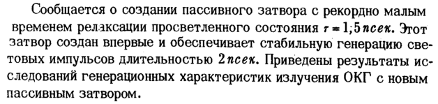 Сообщается о создании пассивного затвора с рекордно малым временем релаксации просветленного состояния т = \;Ьпсе%. Этот затвор создан впервые и обеспечивает стабильную генерацию световых импульсов длительностью 2псек. Приведены результаты исследований генерационных характеристик излучения ОКГ с новым пассивным затвором.