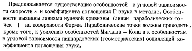 Предсказывается существование особенностей в угловой зависимости скорости s и коэффициента поглощения Г звука в металле. Особенности вызваны линиями нулевой кривизны (линии параболических точек ) на поверхности Ферми. Параболические точки должны приводить, кроме того, к усилению особенностей Мигдала Кона и к особенностям в угловой зависимости пиппардовских (геометрических) осцилляции коэффициента поглощения звука.