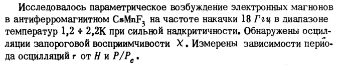 Исследовалось параметрическое возбуждение электронных магнонов в антиферромагнитном CsMnF3 на частоте накачки 18 Ггц в диапазоне температур 1,2 * 2,2К при сильной надкритичности. Обнаружены осцилляции запороговой восприимчивости X · Измерены зависимости периода осцилляций г от Η и Р/Рс.