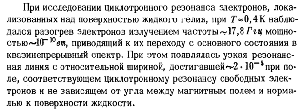 При исследовании циклотронного резонанса электронов, локализованных над поверхностью жидкого гелия, при Τ= 0,4 К наблюдался разогрев электронов излучением частоты<-Л7,8 Ггц мощно-стью~1(Г10вт, приводящий к их переходу с основного состояния в квазинепрерывный спектр. При этом появлялась узкая резонансная линия с относительной шириной, достигавшей^ · 10"'при поле, соответствующем циклотронному резонансу свободных электронов и не зависящем от угла между магнитным полем и нормалью к поверхности жидкости.