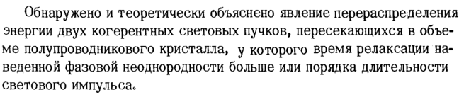 Обнаружено и теоретически объяснено явление перераспределения энергии двух когерентных световых пучков, пересекающихся в объеме полупроводникового кристалла, у которого время релаксации наведенной фазовой неоднородности больше или порядка длительности светового импульса.