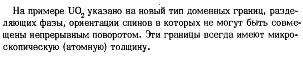 На примере U02 указано на новый тип доменных границ, разделяющих фазы, ориентации спинов в которых не могут быть совмещены непрерывным поворотом. Эти границы всегда имеют микроскопическую (атомную) толщину.
