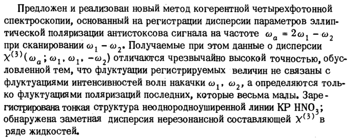 Предложен и реализован новый метод когерентной четырехфотонной спектроскопии, основанный на регистрации дисперсии параметров эллиптической поляризации антистоксова сигнала на частоте ωα=2ω1-ω2 при сканировании ω ι со2. Получаемые при этом данные о дисперсии Χ(3)(ωα ; ωι, ωι, -ω2) отличаются чрезвычайно высокой точностью, обусловленной тем, что флуктуации регистрируемых величин не связаны с флуктуациями интенсивностей волн накачки ω1, ω2, а определяются только флуктуациями поляризаций последних, которые весьма малы. Зарегистрирована тонкая структура неоднородноуширенной линии КР ΗΝ03; обнаружена заметная дисперсия нерезонансной составляющей У(3) в ряде жидкостей.
