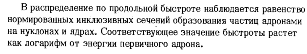 В распределение по продольной быстроте наблюдается равенство нормированных инклюзивных сечений образования частиц адронами на нуклонах и ядрах» Соответствующее значение быстроты растет как логарифм от энергии первичного адрона.