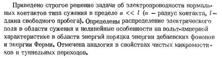 Приведено строгое решение задачи об электропроводности нормальных контактов типа сужения в пределе а « I {а — радиус контакта, /-длина свободного пробега)» Определены распределение электрического поля в области сужения и нелинейные особенности на вольт-амперной характеристике в области энергий порядка энергии дебаевских фононов и энергии Ферми. Отмечена аналогия в свойствах чистых микромостиков и туннельных переходов.
