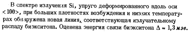 В спектре излучения Si, упруго деформированного вдоль оси < 100>, при больших плотностях возбуждения и низких температурах обнаружена новая линия,, соответствующая излучательному распаду биэкситона. Оценена энергия связи биэкситона Δ « 1,3 мэв*