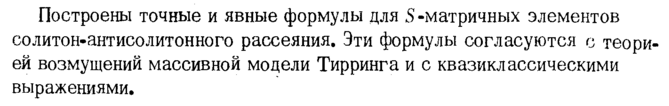 Построены точные и явные формулы для S -матричных элементов солитон-антисолитонного рассеяния. Эти формулы согласуются о теорией возмущений массивной модели Тирринга и с квазиклассическими выражениями.