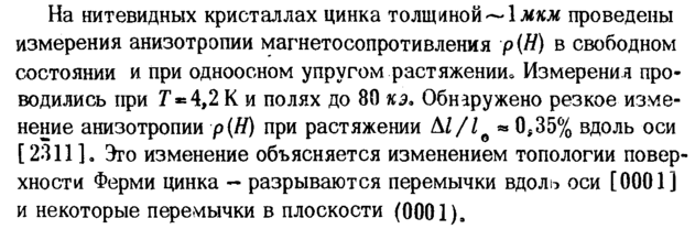 На нитевидных кристаллах цинка толщиной — \мкм проведены измерения анизотропии магнетосопротивления ρ {Η) в свободном состоянии и при одноосном упругом растяжении» Измерения проводились при Τ«4,2 К и полях до 80 кэ. Обнаружено резкое изменение анизотропии р(Н) при растяжении Δ///β * 0,35% вдоль оси [2311], Это изменение объясняется изменением топологии поверхности Ферми цинка разрываются перемычки вдоль оси [0001] и некоторые перемычки в плоскости (0001)а