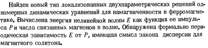 Найден новый тип локализованных двухпараметрических решений одномерных динамических уравнений для намагниченности в ферромагнетике. Вычислена энергия нелинейной волны Ε как функция ее импульса Ρ и числа связанных магнонов в волне. Обнаружена формально периодическая зависимость Ε от Р, имеющая смысл закона дисперсии для магнитного солитона.