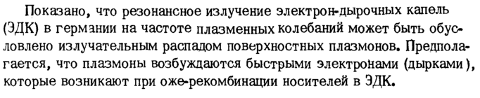 Показано, что резонансное излучение электрон-дырочных капель (ЭДК) в германии на частоте плазменных колебаний может быть обусловлено излучательным распадом поверхностных плазмонов. Предполагается, что плазмоны возбуждаются быстрыми электронами (дырками), которые возникают при оже-рекомбинации носителей в ЭДК.