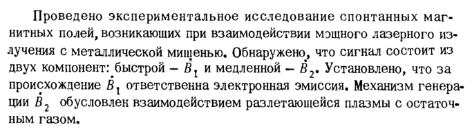 Проведено экспериментальное исследование спонтанных магнитных полей, возникающих при взаимодействии мэщного лазерного излучения с металлической мишенью. Обнаружено, что сигнал состоит из двух компонент: быстрой Βχ и медленной В2. Установлено, что за происхождение Βχ ответственна электронная эмиссия. Механизм генерации В2 обусловлен взаимодействием разлетающейся плазмы с остаточным газом.
