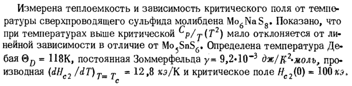 Измерена теплоемкость и зависимость критического поля от температуры сверхпроводящего сульфида молибдена Mo6NaS8. Показано, что при температурах выше критической ^ρ/γ(Τ2) мало отклоняется от линейной зависимости в отличие от Mo5SnS6. Определена температура Де-бая ®D = 118К, постоянная Зоммерфельда у= 9,2·10~3 дж/К2*молъ, производная (dHc2 /dT)T_j =12,8 %э/К и критическое поле #с2(0) = 100«5*