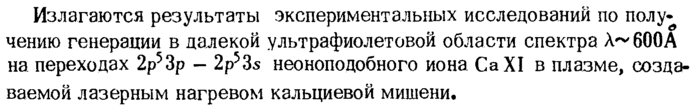 Излагаются результаты экспериментальных исследований по полу-чению генерации в далекой ультрафиолетовой области спектра λ~600Α на переходах 2р53р 2p53s неоноподобного иона CaXI в плазме, создаваемой лазерным нагревом кальциевой мишени.