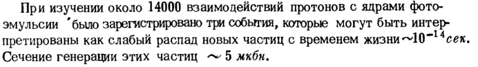 При изучении около 14000 взаимодействий протонов с ядрами фотоэмульсии 'было зарегистрировано три события, которые могут быть интерпретированы как слабый распад новых частиц с временем жизни~10~14е£я. Сечение генерации этих частиц ~ 5 мкбн.