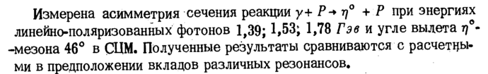 Измерена асимметрия сечения реакции у+ Р-* η° + Ρ при энергиях линейно-поляризованных фотонов 1,39; 1,53; 1,78 Гэв и угле вылета rj0--мезона 46° в CUM. Полученные результаты сравниваются с расчетными в предположении вкладов различных резонансов.