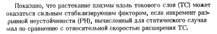Показано, Что растекание плазмы вдоль токового слоя (ТС) может оказаться сильным стабилизирующим фактором, если инкремент разрывной неустойчивости (РН), вычисленный для статического случая мал по сравнению с относительной скоростью расширения ТС.
