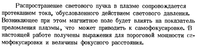 Распространение светового пучка в плазме сопровождается протеканием тока, обусловленного действием светового давления. Возникающее при этом магнитное поле будет влиять на показатель преломления плазмы., что может приводить к самофокусировке. 'В настоящей работе получены выражения для пороговой мощности самофокусировки и величины фокусного расстояния.
