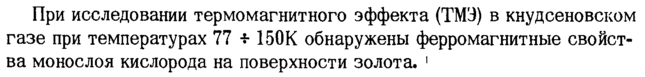 При исследовании термомагнитного эффекта (ТМЭ) в кнудсеновском газе при температурах 77 * 150К обнаружены ферромагнитные свойства монослоя кислорода на поверхности золота. 1