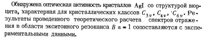 Обнаружена оптическая активность кристаллов Agl со структурой вюр-цита, характерная для кристаллических классов C3v, C4v> 'C6v* Результаты проведенного теоретического расчета спектров отражения в области экситонного резонанса В η ~ 1 сопоставляются с экспериментальными данными.