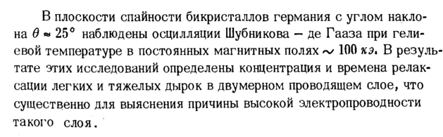 В плоскости спайности бикристаллов германия с углом наклона θ « 25° наблюдены осцилляции Шубникова де Гааза при гелиевой температуре в постоянных магнитных полях ^ 100 %э* В результате этих исследований определены концентрация и времена релаксации легких и тяжелых дырок в двумерном проводящем слое, что существенно для выяснения причины высокой электропроводности такого слоя.
