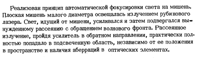 Рёализован принцип автоматической фокусировки света на мишень. Плоская мишень малого диаметра освещалась излучением рубинового лазера. Свет, идущий от мишени, усиливался и затем подвергался вынужденному рассеянию с обращением волнового фронта. Рассеянное излучение, пройдя усилитель в обратном направлении, практически полностью попадало в подсвеченную область, независимо от ее положения в пространстве и наличия аберраций в оптических элементах.